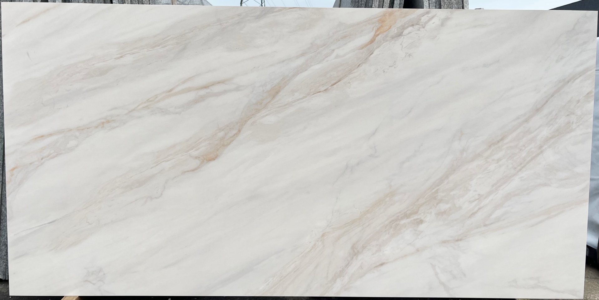 Fusion White to kremowo-białe tło z delikatnymi żyłkami w odcieniach beżu i jasnego brązu. Wygląda bardzo elegancko i subtelnie, z miękkimi, falującymi wzorami.