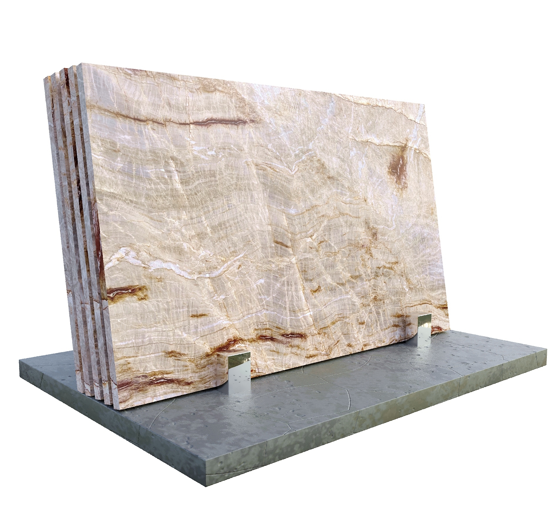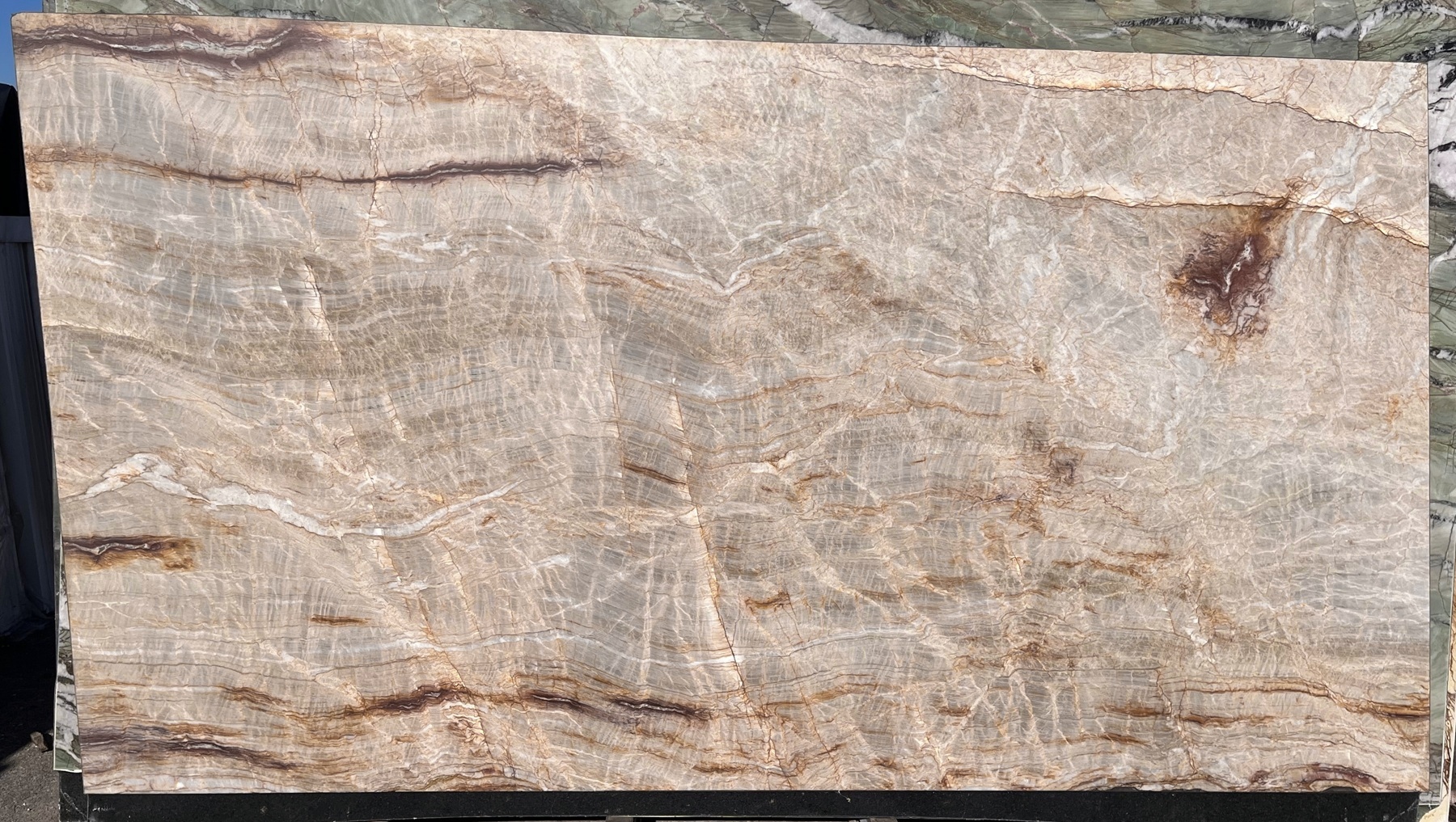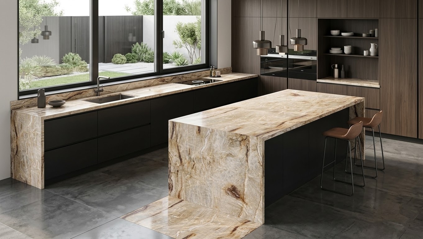 Nacarado Quartzite to naturalny kwarcyt dekoracyjny wydobywany w Brazylii. Kamień ten wyróżnia się ciepłą kolorystyką w odcieniach beżu, kremu i złota, często z falistymi żyłami w barwach brązu, czerwieni lub bieli, które tworzą dynamiczny i egzotyczny wzór.