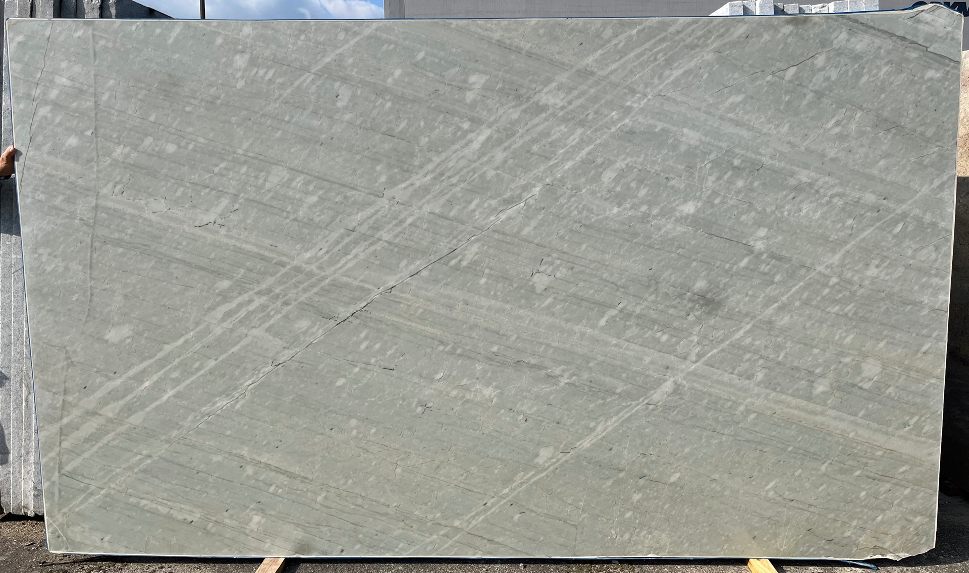 Verde Caribbean ma delikatną, elegancką kolorystykę w odcieniach jasnej, lekko szarozielonej zieleni z subtelnymi białawymi i srebrzystymi żyłkami biegnącymi ukośnie przez całą powierzchnię. Struktura jest drobnoziarnista i jednorodna, a układ żył nadaje mu dynamiczny, ale jednocześnie spokojny i harmonijny charakter. Ten rzadki Kwarcyt naturalny sprawia wrażenie chłodnego i nowoczesnego, dobrze komponującego się z minimalistycznymi wnętrzami, drewnem lub metalem. Dzięki swojej twardości i odporności (typowej dla kwarcytu) idealnie nadaje się na blaty kuchenne, ściany, podłogi lub okładziny dekoracyjne.